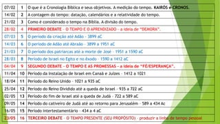 O documento discute o tema do tempo e das promessas de Deus, com foco na ideia de fé e esperança. Apresenta uma série de aulas que abordam períodos bíblicos desde a Criação até Jesus, mostrando como Deus cumpriu Suas promessas ao longo do tempo. O documento sugere que o tempo serve como instrumento para aprender sobre as promessas de Deus e como estas proporcionam esperança e fé.