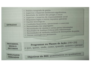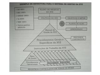 O documento discute os sistemas de gestão e fornece detalhes sobre as etapas de planejamento, preparação e implementação de um sistema de gestão. Também define termos importantes e discute premissas, estruturas documentais e responsabilidades necessárias para implantar com sucesso um sistema de gestão.
