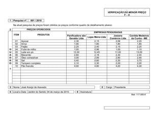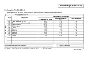 Este documento apresenta os resultados de duas pesquisas de preços de produtos realizadas por José Araújo de Azevedo. A primeira pesquisa lista os preços de 10 itens oferecidos por 4 empresas. A segunda pesquisa lista os preços de 10 itens oferecidos por 3 empresas. Ambas as pesquisas foram realizadas em 04 de março de 2010 no município de Jardim do Seridó e assinadas por José Araújo de Azevedo em seu cargo de Presidente.