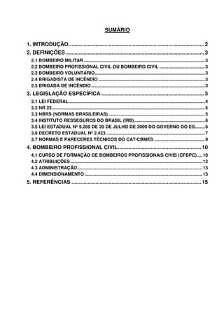 1. O documento discute a legislação e normas relacionadas à profissão de bombeiro profissional civil no Brasil e no Espírito Santo. 2. É definido o que é um bombeiro profissional civil e outras funções relacionadas como bombeiro militar, brigadista e brigada de incêndio. 3. São descritas leis, normas regulamentadoras e normas técnicas que regulamentam a profissão a nível federal, estadual e as atividades de prevenção e combate a incêndio.
