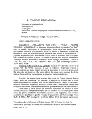 2. Os principais princípios da prova são a livre convicção motivada do juiz, boa-fé, imediação, necessidade e aptidão para provar. A presunção permite inferir a probabilidade de um fato a partir de outro conhecido.