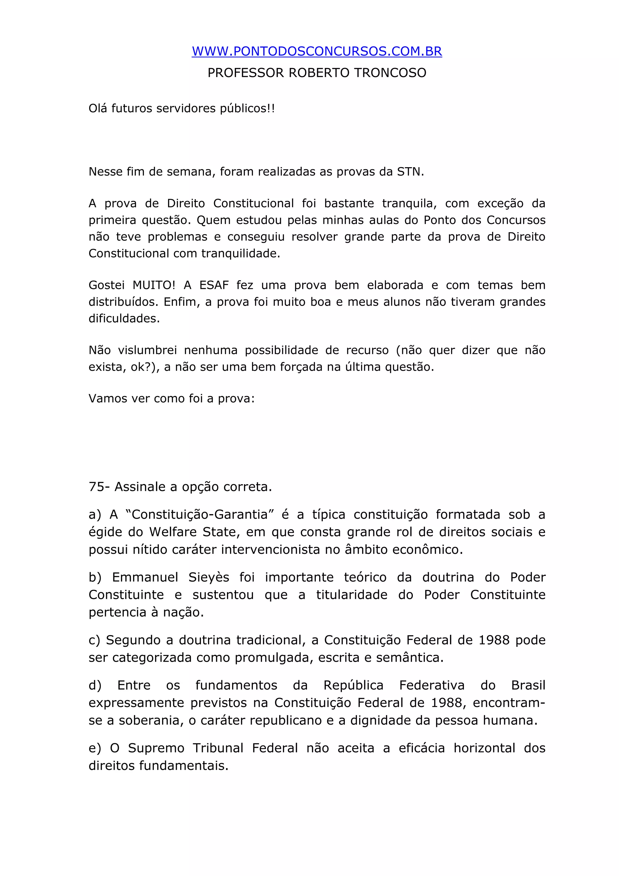 O documento resume uma prova de Direito Constitucional para concurso público. O professor analisa as questões e o gabarito preliminar, explicando porque as alternativas corretas estavam certas e as demais erradas.