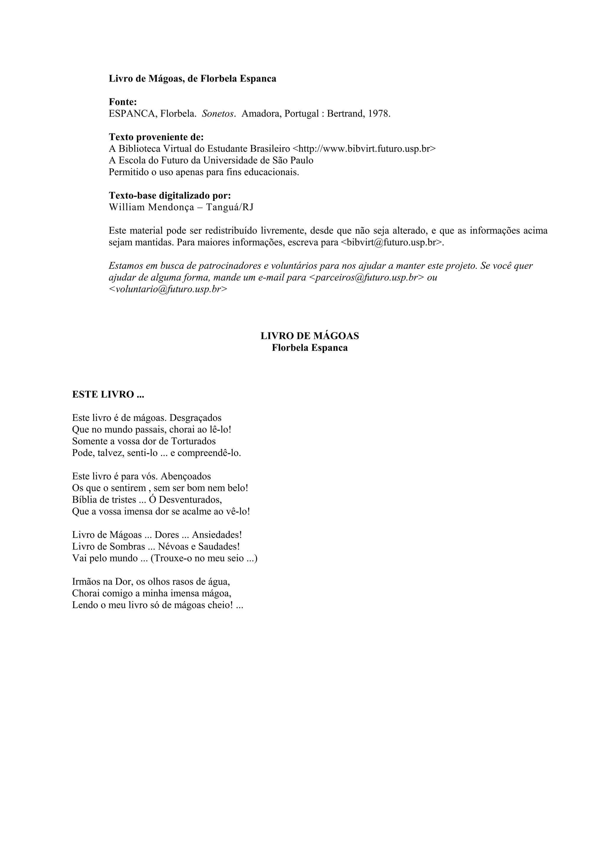 Este documento apresenta um poema de Florbela Espanca intitulado "Livro de Mágoas". O poema descreve o livro como um livro de mágoas e sofrimentos destinado aos desventurados. Pede para que os irmãos na dor chorem com a autora a sua grande mágoa, lendo o livro cheio apenas de mágoas.