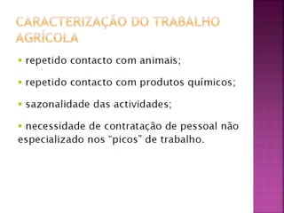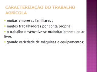 O documento discute um curso vocacional básico em saúde e segurança no trabalho, destacando atividades agrícolas que exigem esforço físico e são realizadas em condições desfavoráveis, com riscos à saúde. Também aborda objetivos e métodos de promover a saúde dos trabalhadores, prevenir acidentes e doenças ocupacionais através da identificação de riscos e implementação de técnicas de prevenção.
