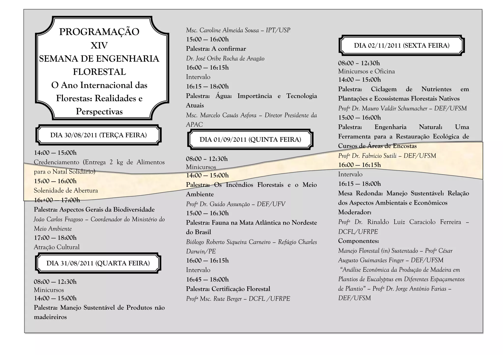 O documento apresenta a programação da XIV Semana de Engenharia Florestal, ocorrenda de 30 de agosto a 2 de setembro de 2011 na Universidade Federal Rural de Pernambuco. A programação inclui palestras, minicursos e oficinas sobre temas relacionados a florestas, como manejo florestal sustentável, incêndios florestais e biodiversidade.