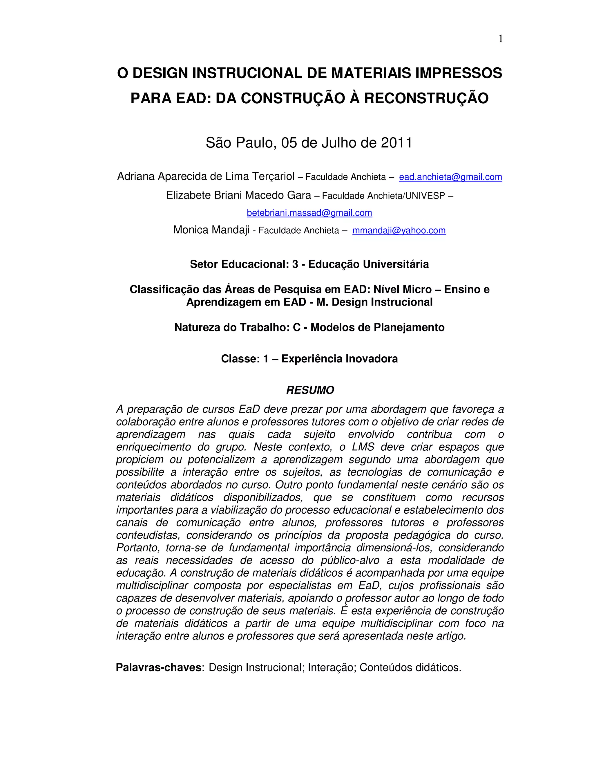 1) O documento discute o design instrucional de materiais impressos para educação a distância na Faculdade Anchieta, com foco na construção desses materiais por uma equipe multidisciplinar e na importância da interação entre alunos e professores.