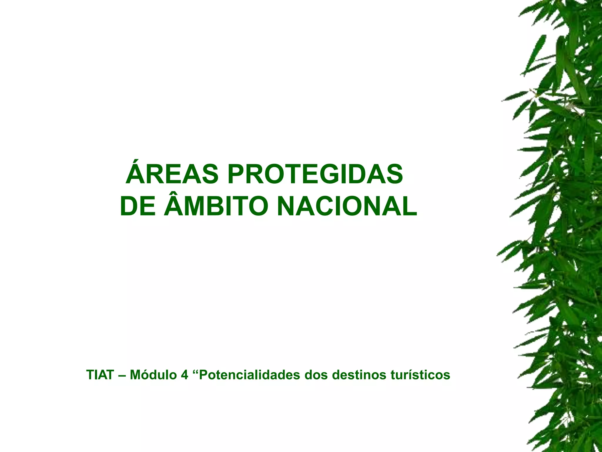 O documento descreve as diferentes categorias de áreas protegidas em Portugal, incluindo parques nacionais, reservas naturais, monumentos naturais e outras. Detalha os objetivos da classificação dessas áreas e fornece definições e exemplos de alguns dos principais parques e reservas, como o Parque Nacional da Peneda-Gerês, o Parque Natural de Montesinho e a Reserva Natural das Dunas de S. Jacinto.