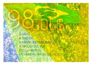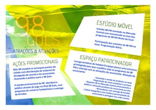 O documento descreve um evento de marketing esportivo organizado pela emissora de rádio 98 FM durante a Copa do Mundo em Belo Horizonte. O 98 Gols será realizado no Mercado Central e incluirá transmissões ao vivo, shows e atrações para divulgar a copa e patrocinadores. O objetivo é promover o turismo, atrair consumidores e dar visibilidade a marcas durante o período do campeonato.