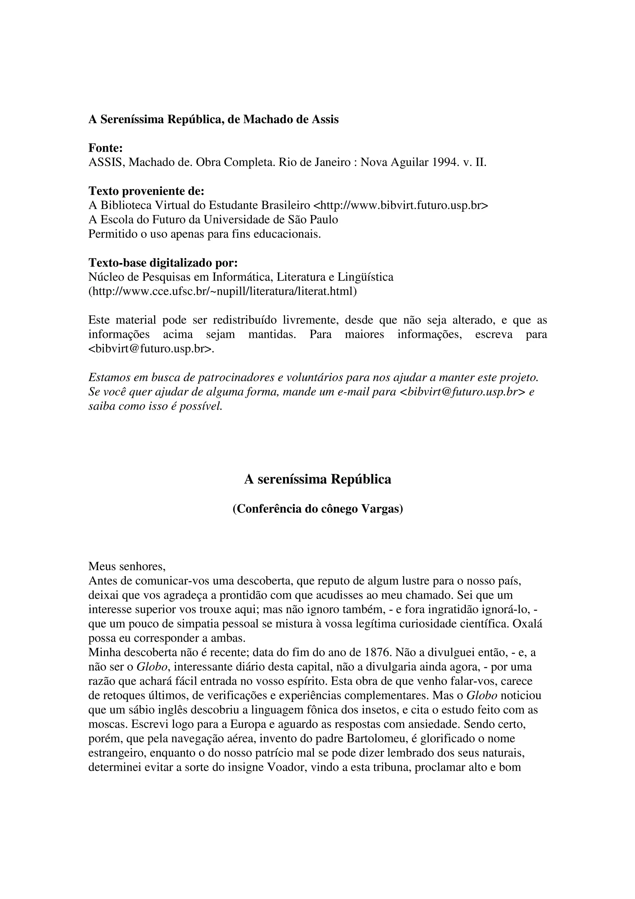 Este documento apresenta um resumo da conferência do cônego Vargas sobre sua descoberta de uma espécie de aranha que desenvolveu uma sociedade organizada e capaz de comunicação através de uma língua complexa. Ele descreve como organizou as aranhas em uma "Sereníssima República" e os desafios iniciais de estabelecer um governo democrático, incluindo a realização de eleições através do uso de um "saco eleitoral".