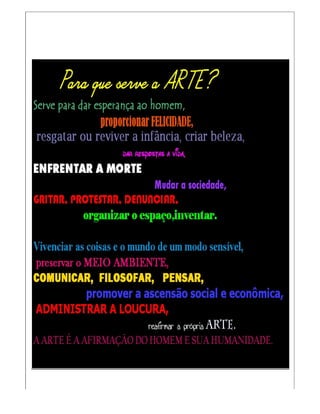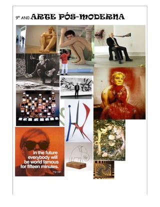 O documento discute a arte pós-moderna e seus principais movimentos, incluindo Pop Art, Op Art, Vídeo Arte e Performance. A arte pós-moderna surgiu na década de 1950 e caracteriza-se pela ausência de um método específico, reunindo tendências heterogêneas. Movimentos como Pop Art criticavam a sociedade de consumo através da apropriação de ícones populares.