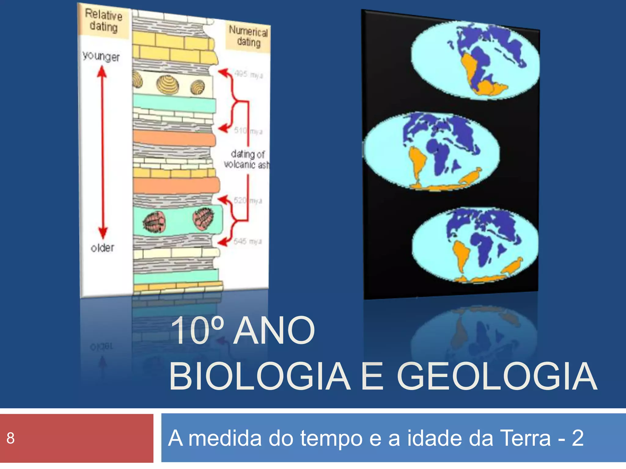 O documento discute métodos para determinar a idade absoluta da Terra, incluindo a descoberta da radioatividade no século 19 e a sugestão de Rutherford em 1905 de que os princípios da radioatividade poderiam ser aplicados para medir com mais precisão a idade das rochas em milhões de anos. Também explica conceitos como semi-vida e que as rochas magmáticas são melhores para esta datação do que sedimentares ou metamórficas devido à mistura de idades.