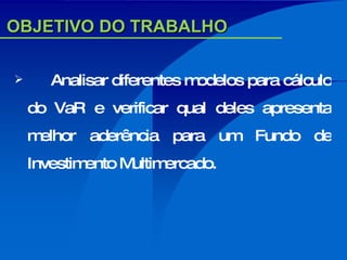 O documento analisa diferentes modelos para calcular o VaR (Value at Risk) de uma carteira de investimentos multimercado. Foram testados os modelos paramétrico, não paramétrico e histórico, sendo que o modelo paramétrico mostrou maior eficiência ao atingir o nível de confiança esperado em dois anos e ter menor desvio médio quando houveram exceções.