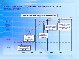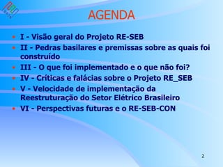 O documento discute o Projeto de Reestruturação do Setor Elétrico (RE-SEB) no Brasil, realizado entre 1996-1998. Apresenta uma visão geral do projeto, suas premissas e implementações, e discute críticas e perspectivas futuras, como a necessidade de acelerar a implementação completa da reestruturação do setor elétrico no país.