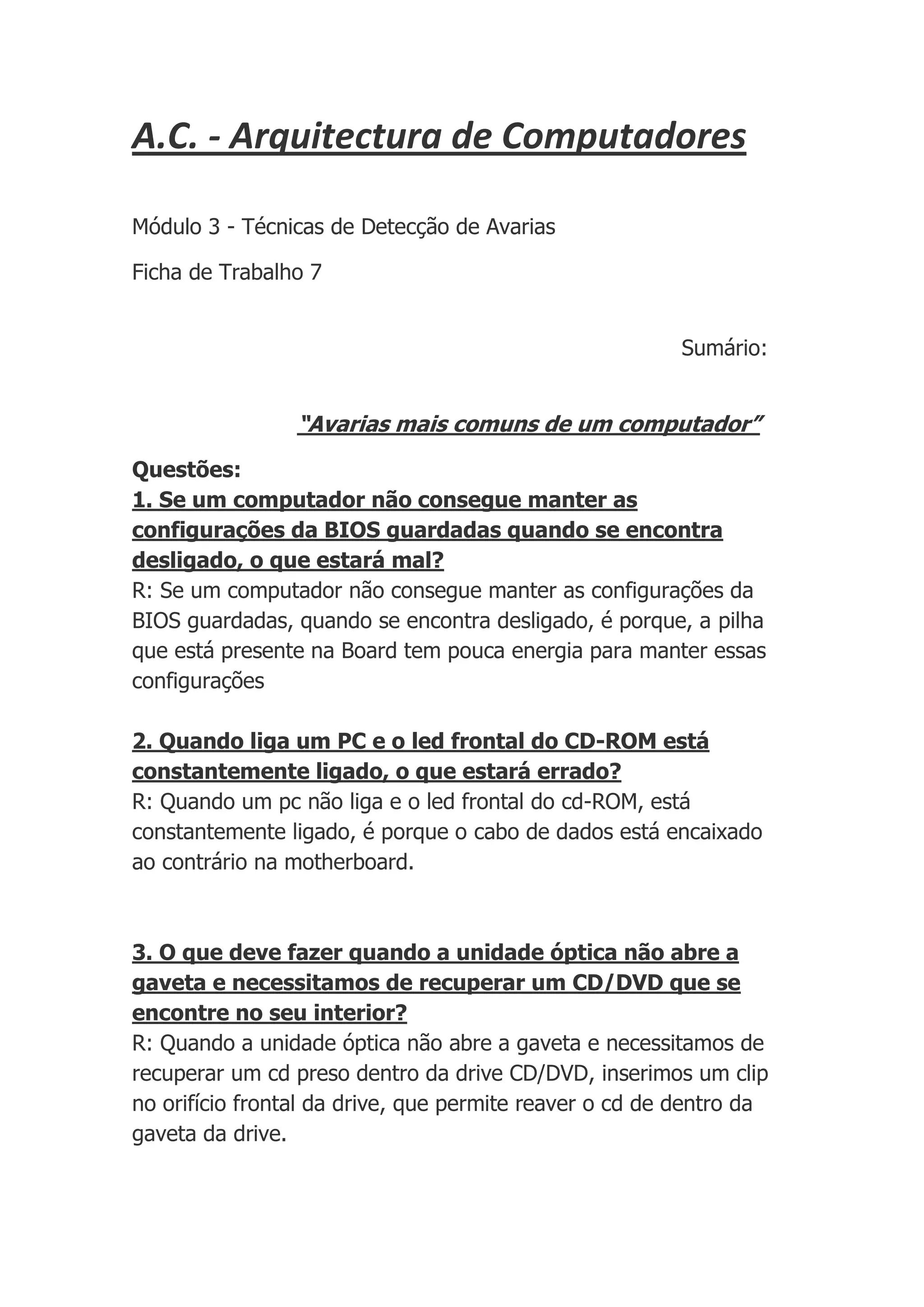 Este documento discute problemas comuns em computadores e suas soluções. Ele fornece respostas para perguntas sobre como corrigir problemas com a BIOS, drives ópticos, luzes da caixa, botões frontais e ruído excessivo do ventilador causado por altas temperaturas.