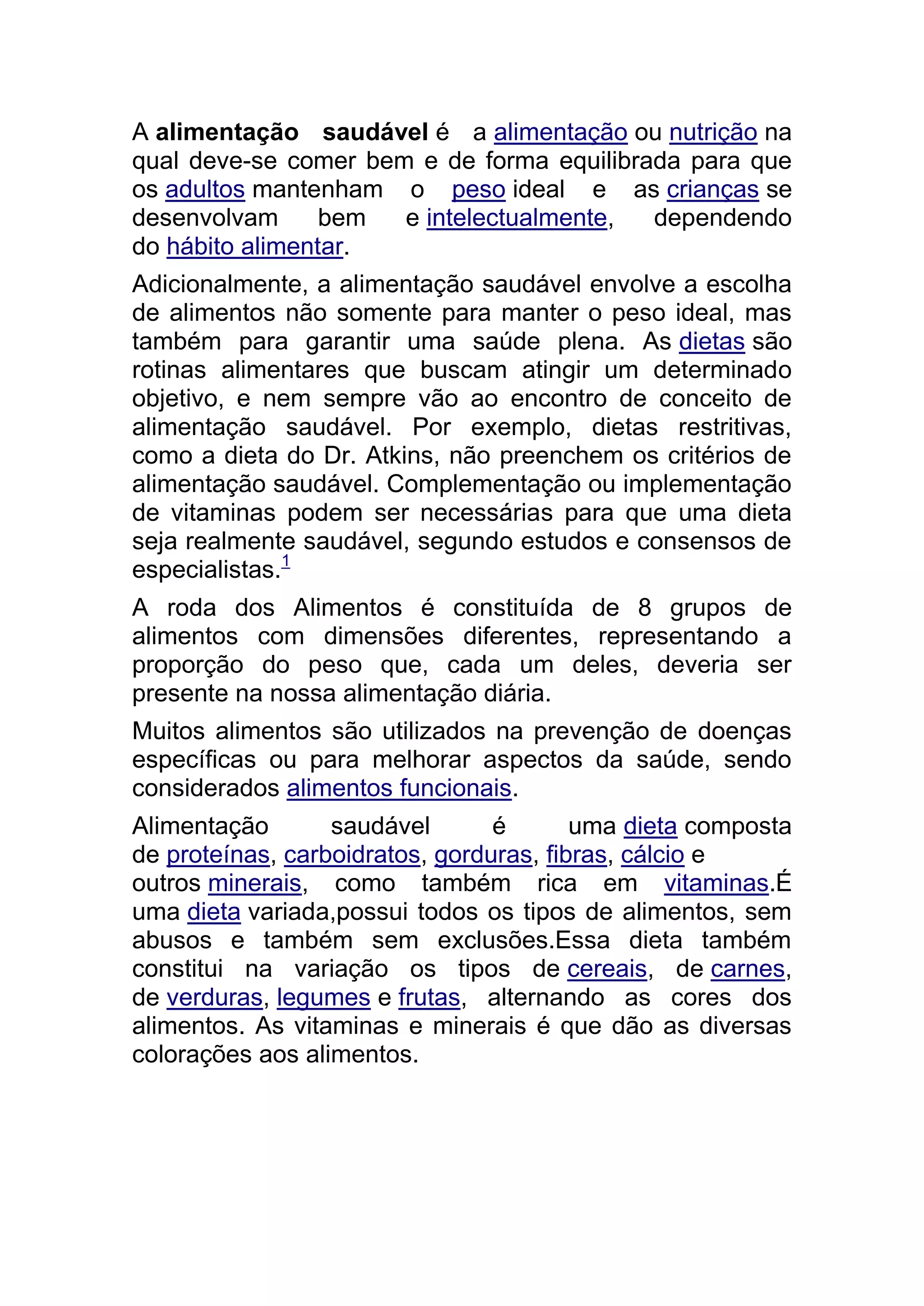 O documento discute o que constitui uma alimentação saudável, incluindo comer de forma equilibrada para manter o peso ideal e o desenvolvimento das crianças, escolher alimentos para garantir saúde completa, e não seguir dietas restritivas que não fornecem nutrientes essenciais. A roda dos alimentos representa os grupos de alimentos e suas proporções recomendadas, e alguns alimentos específicos podem prevenir doenças ou melhorar a saúde. Uma alimentação saudável envolve uma dieta variada de proteínas