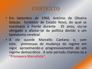 Este documento descreve o contexto político em Portugal após a saída de António de Oliveira Salazar em 1968 e a ascensão de Marcello Caetano. A Ala Liberal, liderada por Francisco Sá Carneiro, tentou promover reformas democráticas, mas teve pouco sucesso. Isso desacreditou a chamada "Primavera Marcelista" e contribuiu para a Revolução dos Cravos em 1974.