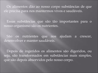 Os nutrientes são substâncias essenciais fornecidas pelos alimentos que nos ajudam a crescer, desenvolver e manter saudáveis. Os principais nutrientes incluem proteínas, hidratos de carbono, gorduras, vitaminas, minerais e água, que desempenham funções energéticas, construtoras e reguladoras no corpo. Uma alimentação saudável deve incluir variedade e equilíbrio entre os diferentes grupos alimentares.