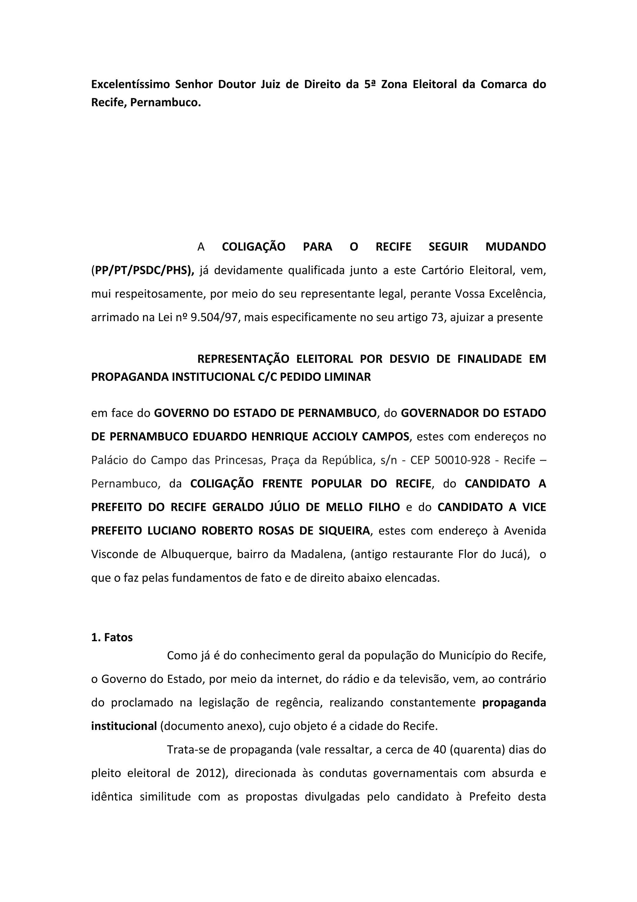 A Coligação Para o Recife Seguir Mudando entrou com uma representação eleitoral contra o Governo de Pernambuco, o governador Eduardo Campos e a Coligação Frente Popular do Recife por propaganda institucional com desvio de finalidade. A propaganda, veiculada a 40 dias das eleições, promovia propostas do candidato Geraldo Júlio de forma idêntica, beneficiando indevidamente sua campanha e ferindo a isonomia entre os candidatos.