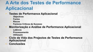 Este documento discute os testes de performance aplicacional, incluindo objetivos como determinar a velocidade, escalabilidade e estabilidade dos sistemas. Ele explica como os testes de performance simulam usuários reais para avaliar o desempenho sob carga e identificar gargalos no sistema. O documento também discute métricas-chave como latência, processamento e utilização de recursos, e enfatiza a importância de comunicar resultados de forma clara e concisa para tomada de decisões.