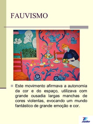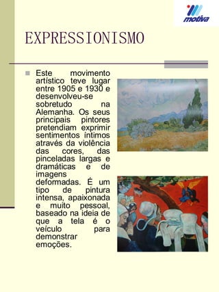 O documento descreve vários movimentos artísticos do início do século XX, incluindo o Expressionismo, Fauvismo, Cubismo, Futurismo, Abstracionismo e Surrealismo. O Expressionismo visava expressar emoções através de cores e pinceladas dramáticas. O Fauvismo usava cores violentas para criar um mundo emocional e fantástico. O Cubismo retratava objetos de várias perspectivas ao mesmo tempo. O Futurismo capturava o movimento através de imagens simultâneas. O Abstracionismo foc