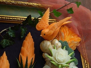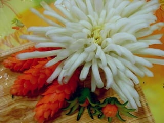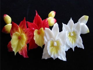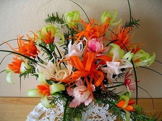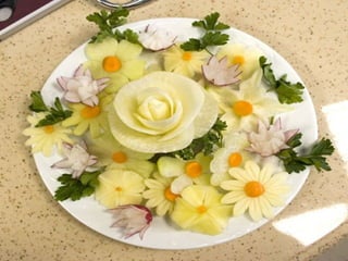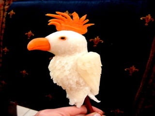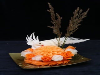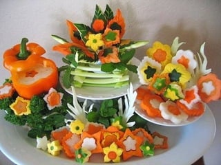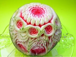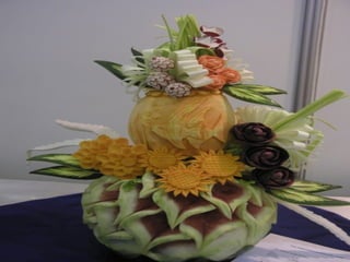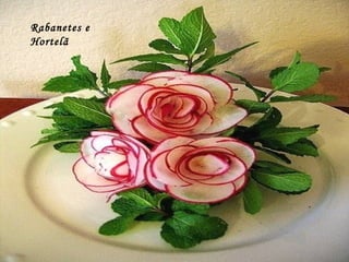 Este documento lista e descreve vários tipos de vegetais, frutas e arranjos comestíveis criados artisticamente para celebrar a conexão entre arte, jardinagem e alimentação saudável. A autora encoraja o leitor a experimentar os produtos frescos da horta e a explorar sua própria criatividade ao arranjar e apresentar os alimentos.