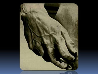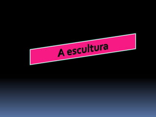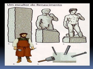 O documento descreve esculturas gregas e obras de Miguel Ângelo e Donatello, incluindo o David de Donatello e as esculturas Pietà do Vaticano e Moisés de Miguel Ângelo. Ele também discute características como realismo, representação do corpo humano, disposição geométrica e expressão de sentimentos em esculturas.
