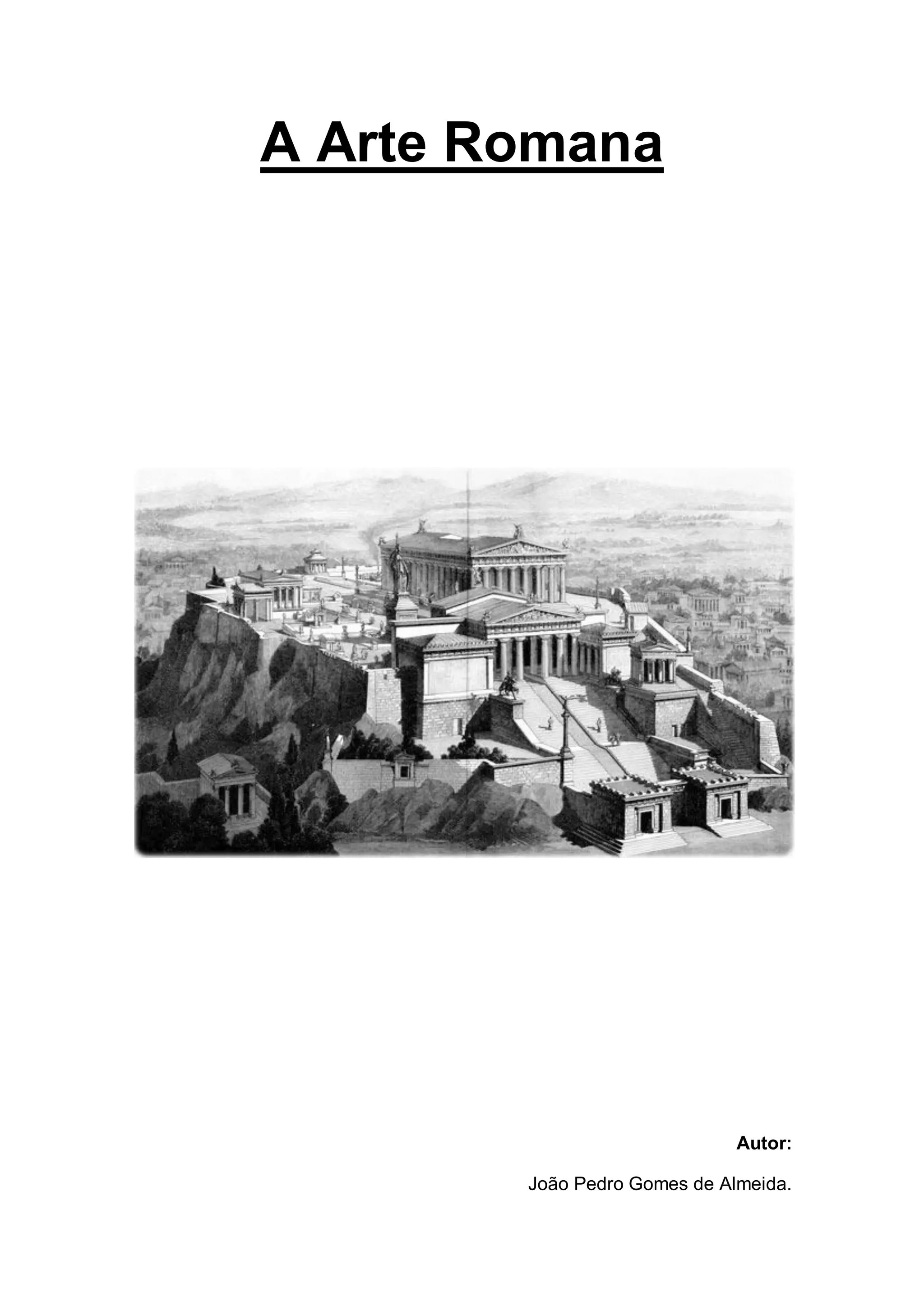 O documento descreve a arquitetura romana, caracterizando-a como funcional e influenciada pela arte grega. A arquitetura romana se destacou na construção de edifícios públicos amplos através do uso do arco e da abóbada. Exemplos incluem aquedutos, templos, arcos de triunfo e termas, que também serviam para o lazer dos romanos.