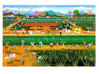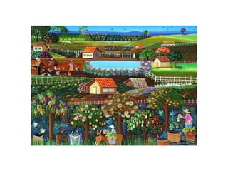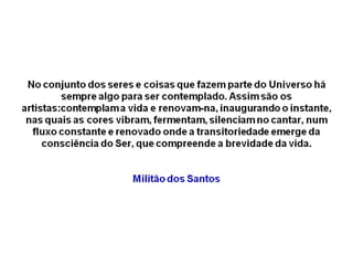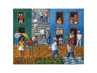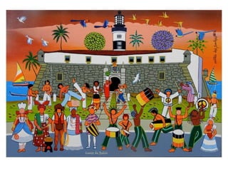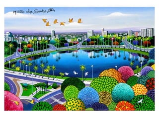 O documento discute a arte naïf, descrevendo-a como uma viagem encantada a um mundo de ingenuidade, cor e poesia. Vários artistas e pensadores citam a importância da criatividade, da liberdade de expressão e da capacidade da arte de capturar a beleza do cotidiano de forma primitiva. A arte naïf busca retratar as expressões alegres da vida de forma espontânea e sem limites.