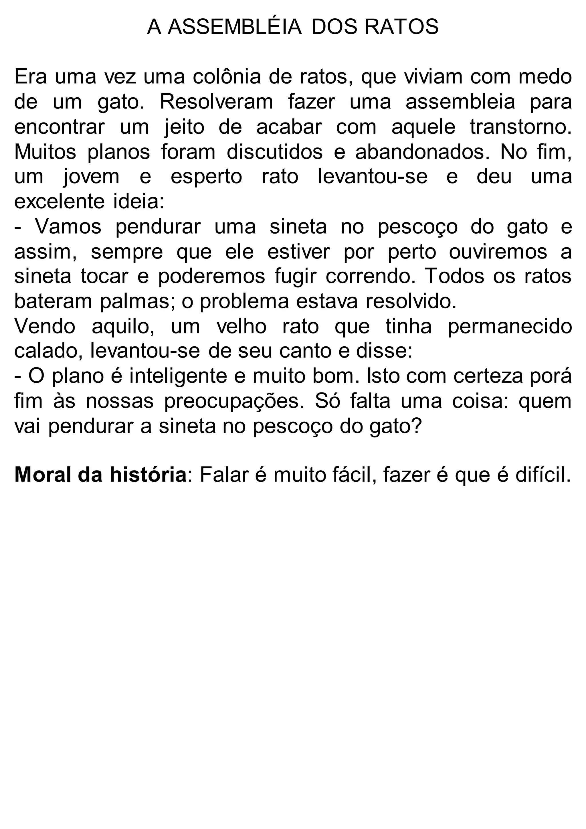 Uma colônia de ratos realizou uma assembleia para discutir como se livrar de um gato que os ameaçava. Um rato jovem sugeriu pendurar uma sineta no pescoço do gato para que pudessem ouvir e fugir quando ele se aproximasse. Todos acharam a ideia brilhante, mas um rato velho apontou que ninguém havia pensado em quem colocaria a sineta no gato.