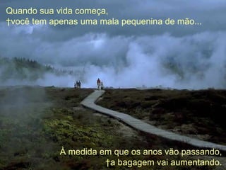 O documento fala sobre como nossa bagagem emocional vai aumentando ao longo da vida à medida que acumulamos experiências, e como é importante desapegar das emoções negativas como raiva, incompreensão e medo que pesam demais. Aconselha a colocar para fora essas emoções e preencher a bagagem com sentimentos positivos como amor, alegria, esperança e coragem para seguir em frente de forma leve.