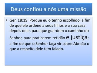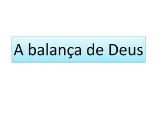 O documento discute a justiça e a balança de Deus, explicando que Deus julga todos com justiça e que a cobiça humana leva à injustiça. A salvação vem por meio de Jesus, que morreu para equilibrar a balança e perdoar a culpa da humanidade. Aqueles que amam a justiça receberão a luz para serem salvos, enquanto os que amam a injustiça permanecerão enganados.