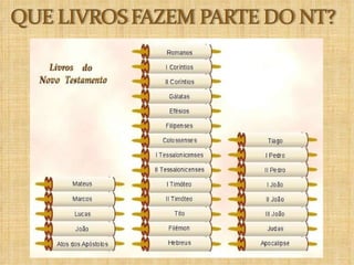 A bíblia contém66 livros e está dividia em 2 partes: A primeira é chamada de Antigo Testamento (contém os livros escritos antes do nascimento de Jesus) A segunda parte é chamada Novo Testamento (contém os livros que narram a vinda de Jesus ao mundo e o que aconteceu depois disso).