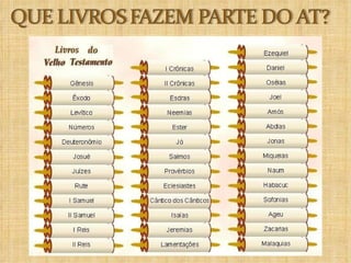 O Velho testamentoainda é dividido em mais 5 partes.Vamos ver: "A Lei (O Pentateuco)” Gênesis, Êxodo, Levítico, Números, Deuteronômio; "Livros Poéticos" Jó, Salmos, Provérbios, Eclesiastes, O Cântico dos Cânticos; "Livros Históricos" Josué, Juízes, Rute, I Samuel, II Samuel, I Reis, II Reis, I Crônicas , II Crônicas, Esdras, Neemias e Ester "Profetas Maiores" Isaías, Jeremias, Lamentações , Ezequiel e Daniel; "Profetas Menores" Oséias, Joel, Amós, Obadias, Jonas, Miquéias, Naum,, Habacuque, Sofonias, Ageu, Zacarias e Malaquias;