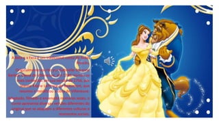 O documento resume a história tradicional de "A Bela e a Fera". A história conta que uma princesa egoísta é amaldiçoada a viver como uma fera até encontrar alguém que a ame. Quando o pai de Bela se perde em uma floresta, ele acaba no castelo da Fera. Bela troca seu lugar pelo de seu pai. Ao longo do tempo, Bela passa a ver a humanidade por trás da aparência monstruosa da Fera.
