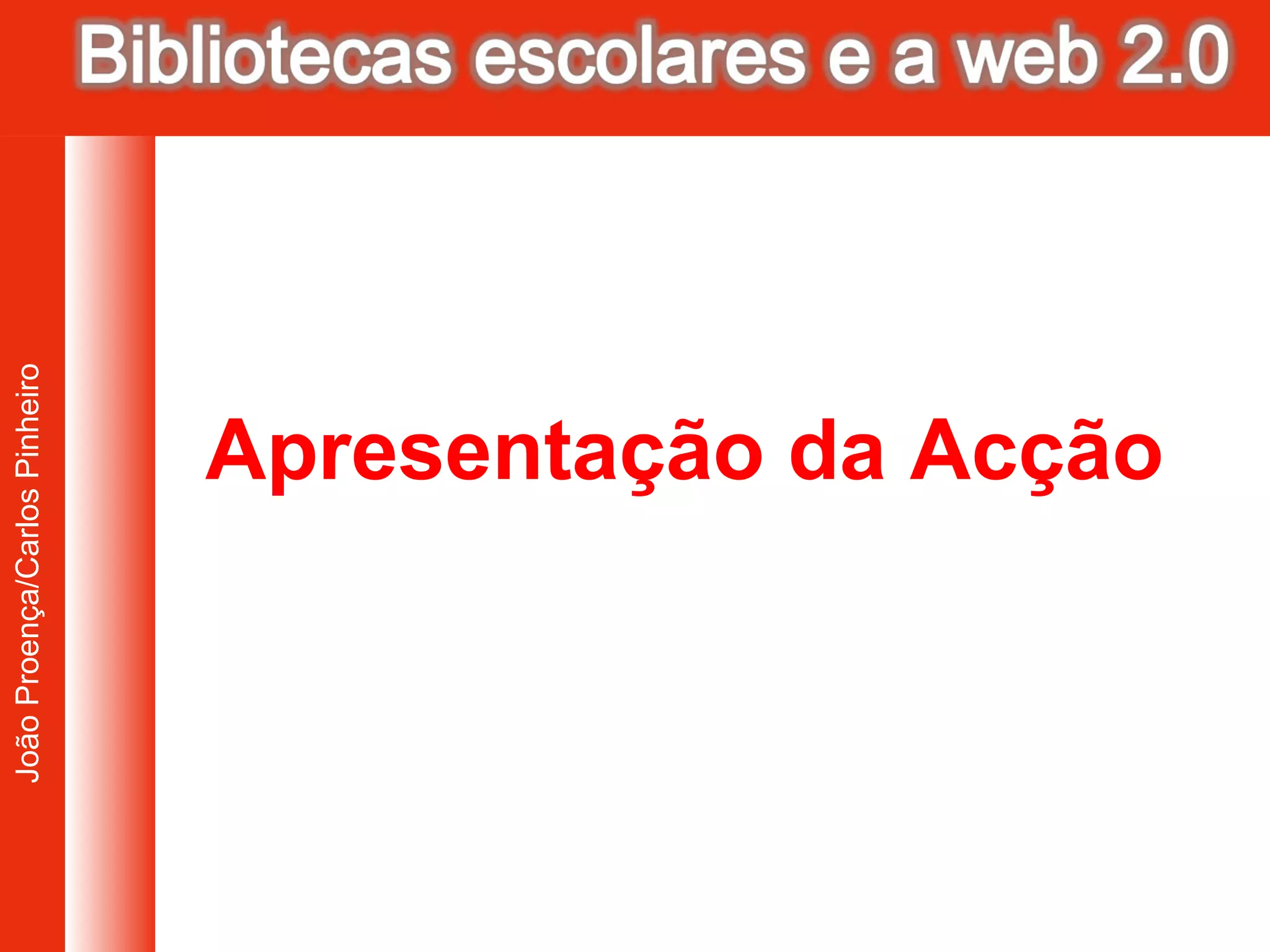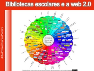 O documento descreve uma formação online de 10 sessões sobre potencialidades da Web 2.0 para bibliotecas escolares, ocorrendo de abril a julho, com encontros semanais de 6 horas para discussão de temas como blogs, bookmarking e redes sociais. Os participantes terão tarefas e debates em fóruns até sábado, com avaliação baseada em assiduidade, qualidade do trabalho e apresentação final.