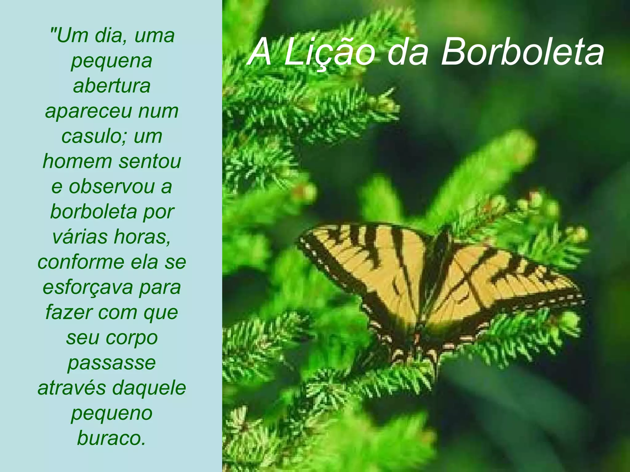 Uma borboleta tentou sair de seu casulo, mas não conseguiu. Um homem cortou o casulo para ajudá-la, mas suas asas ficaram encolhidas e ela nunca pode voar. O esforço para sair do casulo é necessário para que o fluido das asas se desenvolva, assim como os obstáculos na vida nos tornam mais fortes.