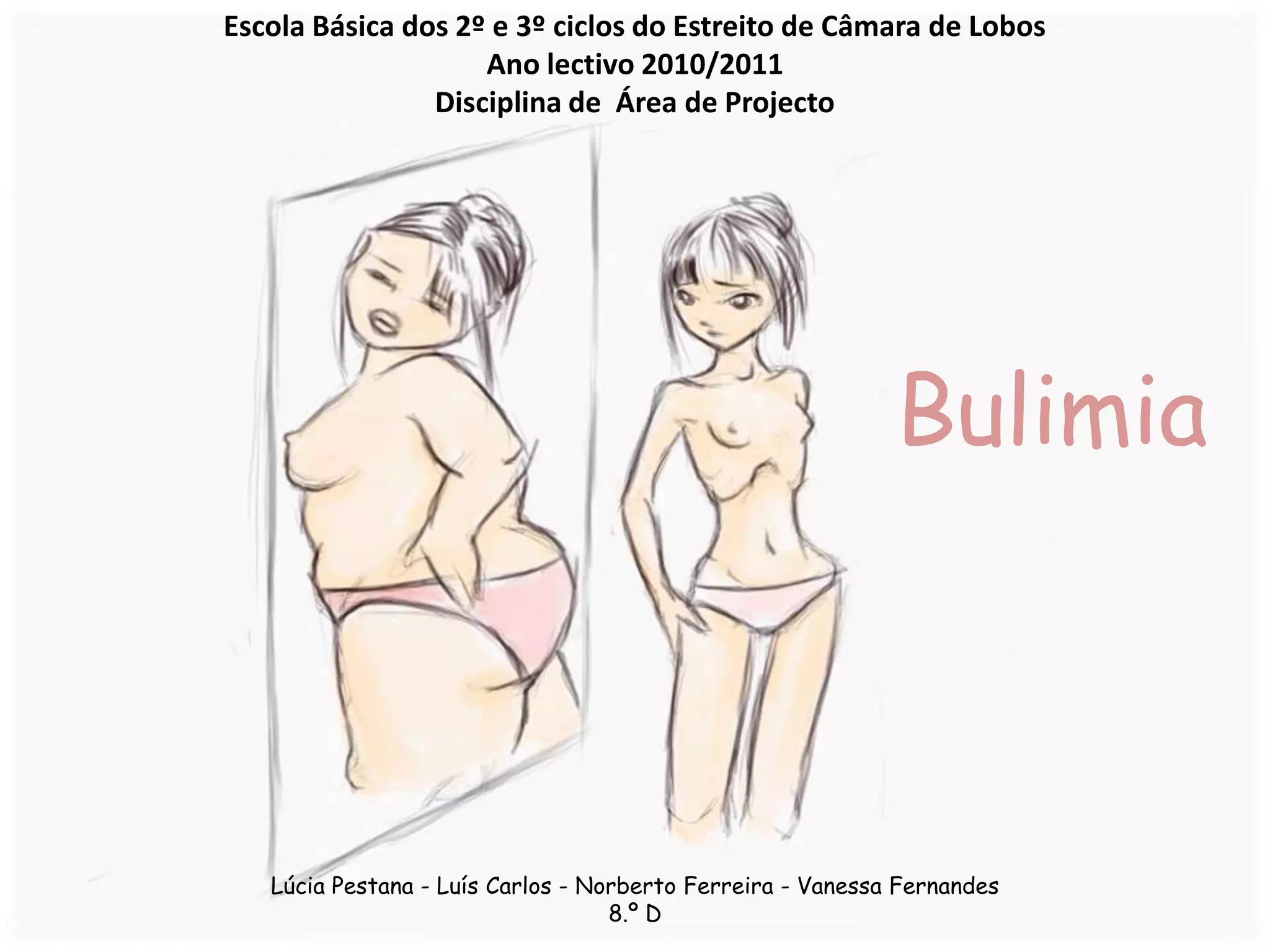 Este documento descreve a bulimia nervosa, incluindo suas causas, sintomas e tratamentos. A bulimia é caracterizada por uma preocupação excessiva com o peso e alimentação descontrolada seguida de comportamentos compensatórios como vômitos. Os tratamentos comuns incluem terapia, grupos de apoio e aconselhamento nutricional. O documento também fornece exemplos reais de pessoas que sofrem com a bulimia.