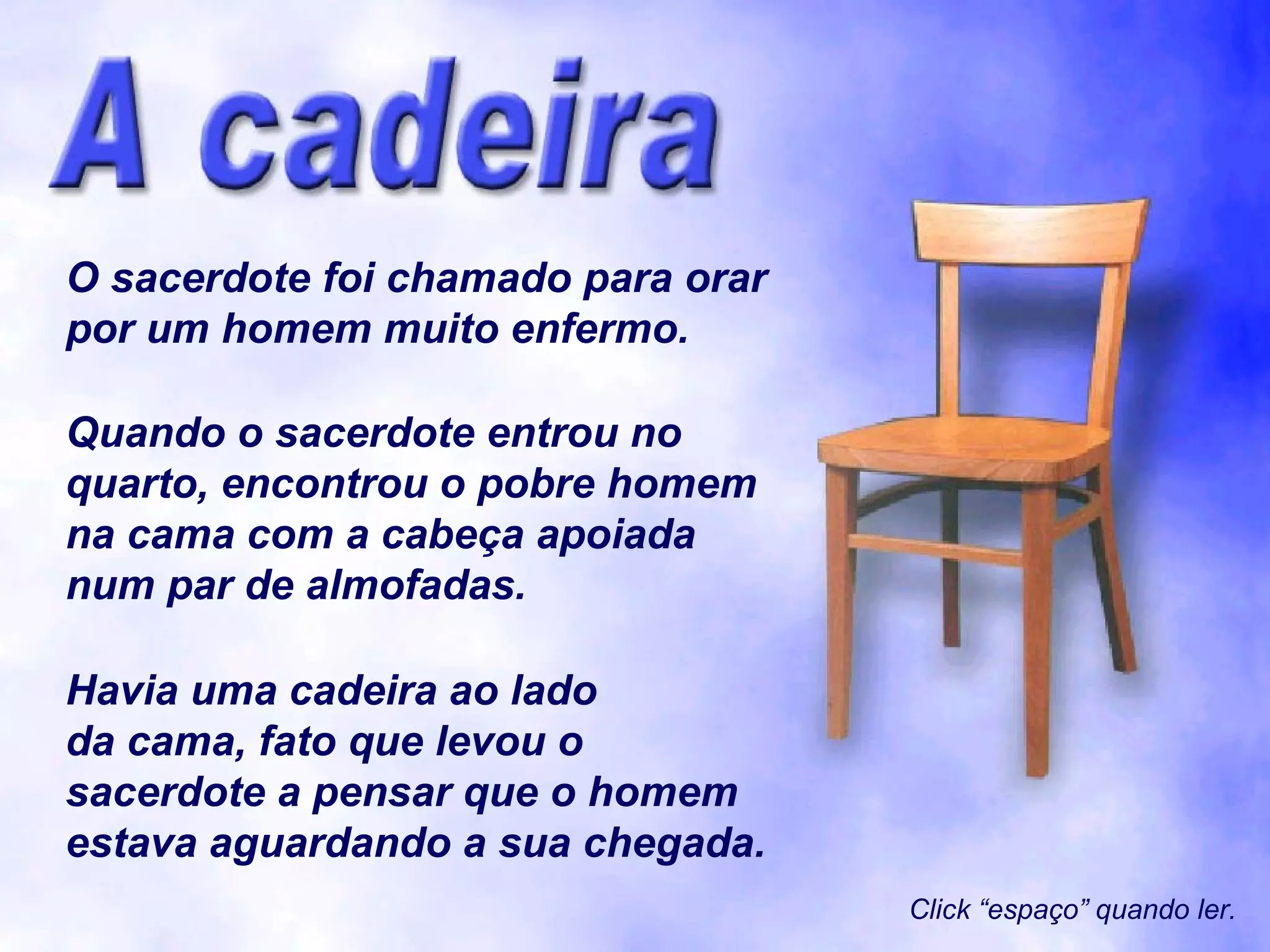 O sacerdote foichamado para orar por um homem muito enfermo. Quando o sacerdote entrou no quarto, encontrou o pobre homem na cama com a cabeça apoiada num par de almofadas. Havia uma cadeira ao lado da cama, fato que levou o sacerdote a pensar que o homem estava aguardando a sua chegada. Click “espaço” quando ler.