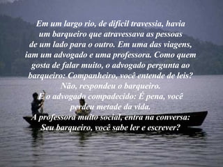 Um barqueiro atravessava pessoas em um rio. Ao conversar com um advogado e uma professora que criticavam ele por não saber leis ou ler, o barco virou e ele perguntou se eles sabiam nadar. Quando eles responderam que não, o barqueiro concluiu que eles perderam toda a vida, mostrando que todos têm saberes valiosos.
