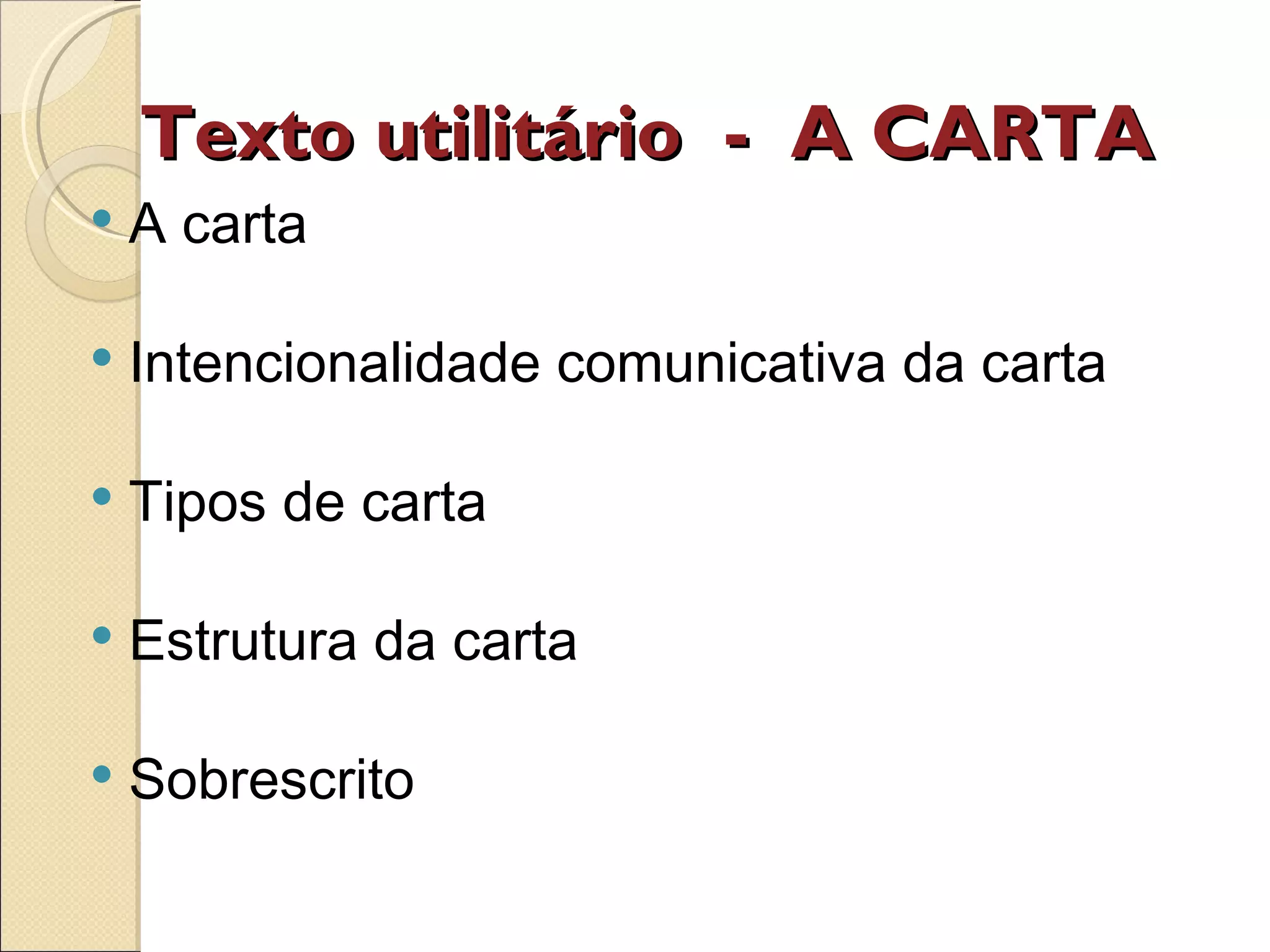 O documento descreve os principais elementos de uma carta, incluindo sua estrutura e tipos. A carta é um instrumento de comunicação entre um remetente e destinatário através de papel. Ela pode ser formal ou informal e tem elementos como cabeçalho, saudações, corpo, fecho e despedidas.