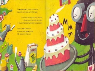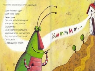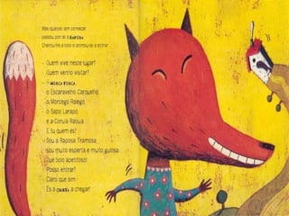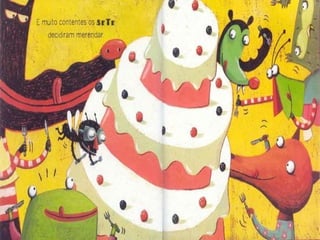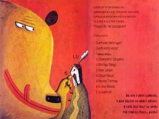 O documento apresenta uma série de perguntas sobre uma narrativa envolvendo uma mosca e vários animais que batem à sua porta. As questões abordam quantos animais chegaram, quais foram suas contribuições e a ordem de chegada, além de questionar a atitude do urso. A história envolve um bolo feito pela mosca com um determinado fruto.