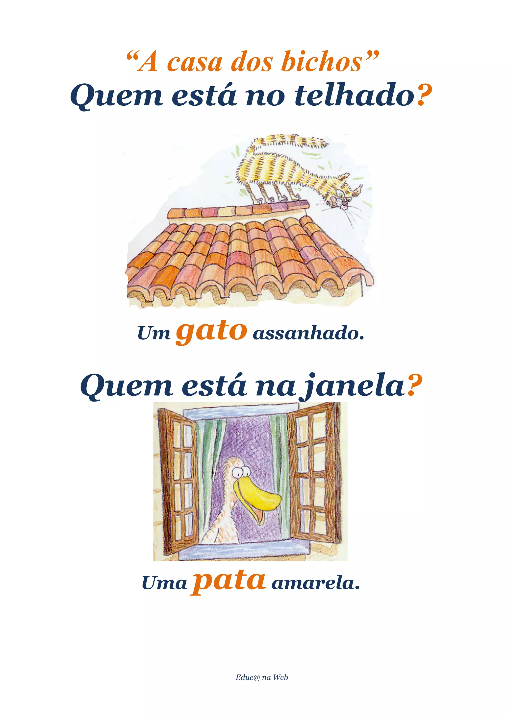 O documento lista os animais que estão em diferentes partes de uma casa, incluindo um gato no telhado, uma pata amarela na janela, um urso panda na varanda, um burro da horta à porta, um pinguim no jardim, um cão com um osso no poço e um bicho falante chamado João no portão.