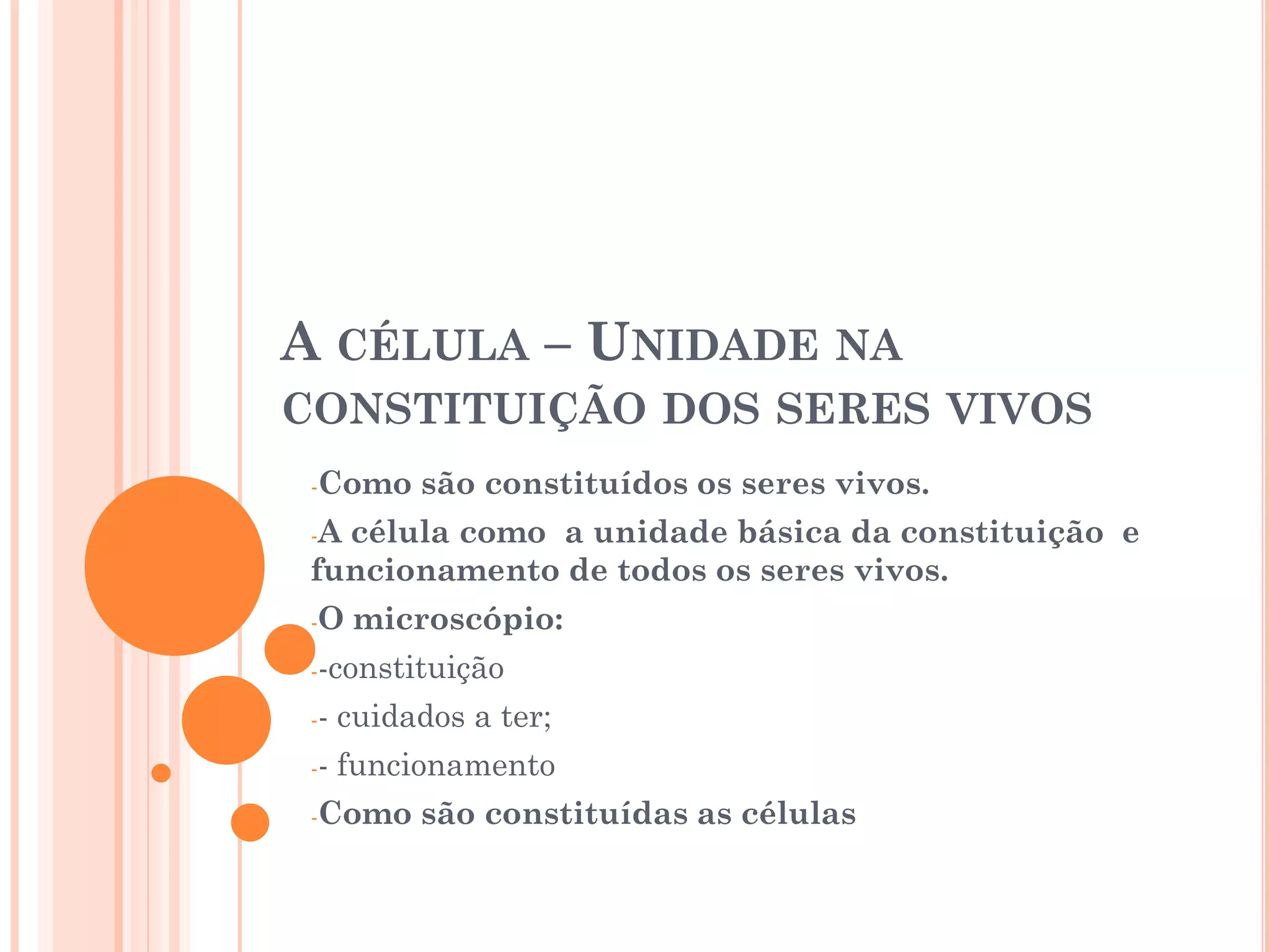 O documento discute a célula como a unidade básica da constituição e funcionamento de todos os seres vivos. Detalha a descoberta das células por Robert Hooke usando um microscópio primitivo e o estabelecimento da teoria celular por Schleiden e Schwann no século XIX. Também descreve as partes e funcionamento do microscópio óptico e técnicas para preparar e observar amostras biológicas.