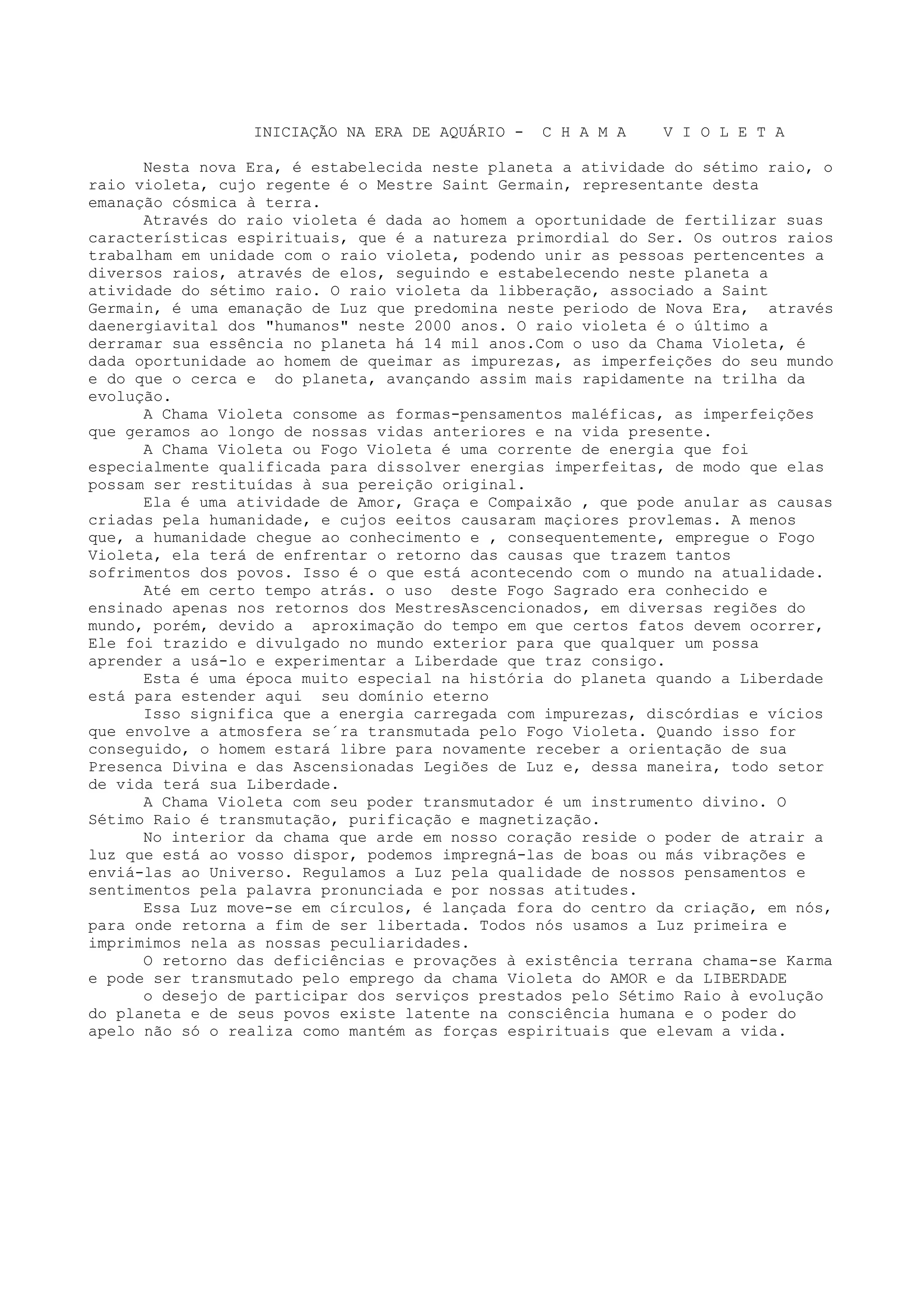 O documento descreve a atividade do Sétimo Raio Violeta e da Chama Violeta nesta nova Era de Aquário. O Raio Violeta oferece a oportunidade de desenvolver características espirituais e unir as pessoas. A Chama Violeta consome pensamentos e imperfeições negativas, libertando a humanidade e permitindo o avanço na evolução.