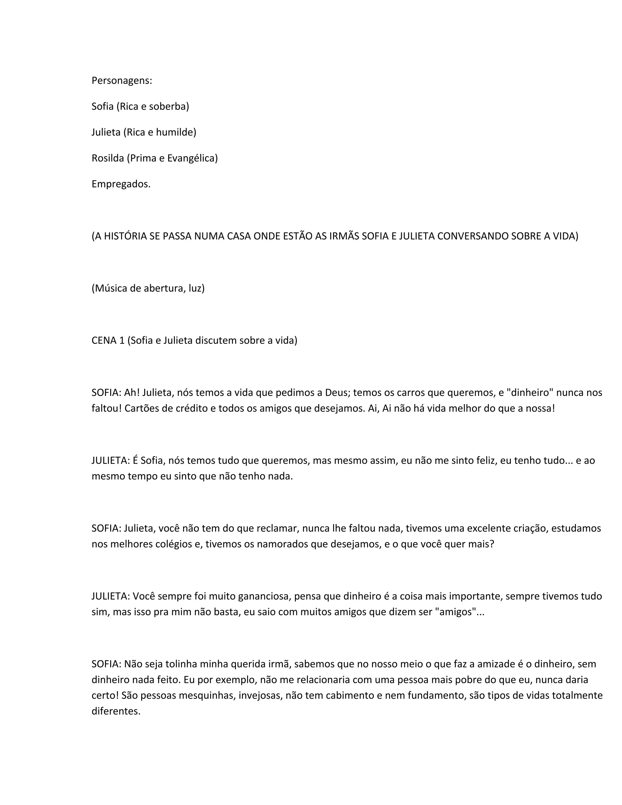 As irmãs Sofia e Julieta discutem suas visões de vida diferentes. Sofia acredita que dinheiro trás felicidade, enquanto Julieta sente um vazio interior apesar das riquezas. Julieta passa a seguir Jesus Cristo e traz sua prima Rosilda, que compartilha sua fé, para ficar com elas, ao descontentamento de Sofia.