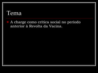 O documento analisa charges da campanha de vacinação obrigatória de 1904, focando nas críticas sociais expressas pelos chargistas. A pesquisa explora o contexto histórico e a forma como a vacinação foi recebida pela população através de representações visuais. Os chargistas, especialmente Oswaldo Cruz, são retratados como figuras centrais, refletindo as tensões da época entre a autoridade e a população.