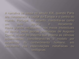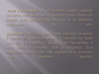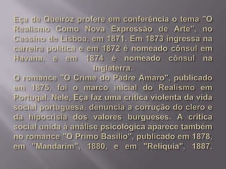 Eça de Queirós (1845-1900) foi um importante escritor português, formado em Direito, que se destacou no jornalismo e na literatura, publicando obras como 'Os Maias' e 'A Cidade e as Serras'. Sua narrativa reflete uma crítica à vida urbana e valoriza as virtudes da vida no campo, apresentando personagens como Jacinto e José Fernandes que simbolizam essa transição. O autor também explora, através de uma prosa rica e bem construída, as ironias e a futilidade da sociedade, especialmente em relação à cultura e progresso.