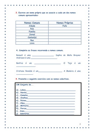 Este documento fornece uma série de exercícios de associação de nomes próprios, comuns e coletivos. O leitor é instruído a identificar nomes que não pertencem a determinados conjuntos, fazer correspondências entre diferentes tipos de nomes, preencher frases com nomes apropriados e associar imagens a nomes coletivos e comuns.