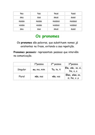 O documento descreve os diferentes tipos de determinantes em português: artigos definidos e indefinidos, demonstrativos e possessivos. Também lista exemplos dos determinantes demonstrativos e possessivos nos gêneros masculino e feminino no singular e plural. Por fim, apresenta uma breve definição dos pronomes e lista os pronomes pessoais nas 1a, 2a e 3a pessoas no singular e plural.