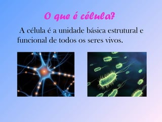 O documento discute o que são células. Explica que as células são a unidade básica de todos os seres vivos e que existem dois tipos principais: células procarióticas e eucarióticas. As células procarióticas são as mais simples e não possuem núcleo, enquanto as células eucarióticas são mais complexas e possuem estruturas como núcleo, membrana celular, organelas e mitocôndrias.